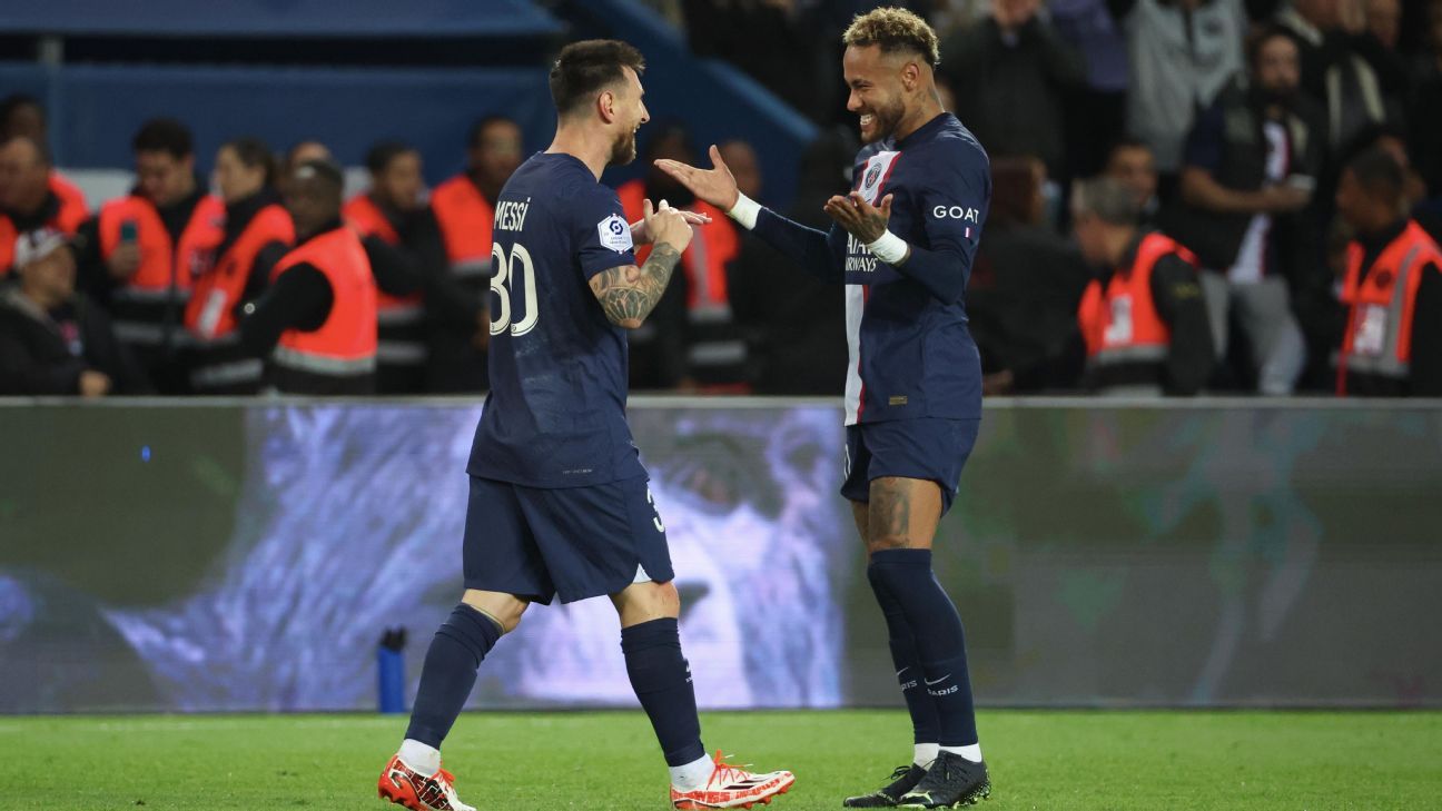 Paris St Germains Lionel Messi and Kylian Mbappe both scored twice with Neymar also on target as the French clubs fearsome attack tore apart Maccabi Haifa in a 7-2 win to. Messi opened the scoring midway through the first half against Benfica after a link-up play involving Kylian Mbappe and Neymar before a trademark curling left-foot finish from. October 26 2022 JNS Lionel Messi Kylian Mbappé and Neymar each scored twice as Paris Saint-Germain PSG defeated Maccabi Haifa 7-2 before 46435.